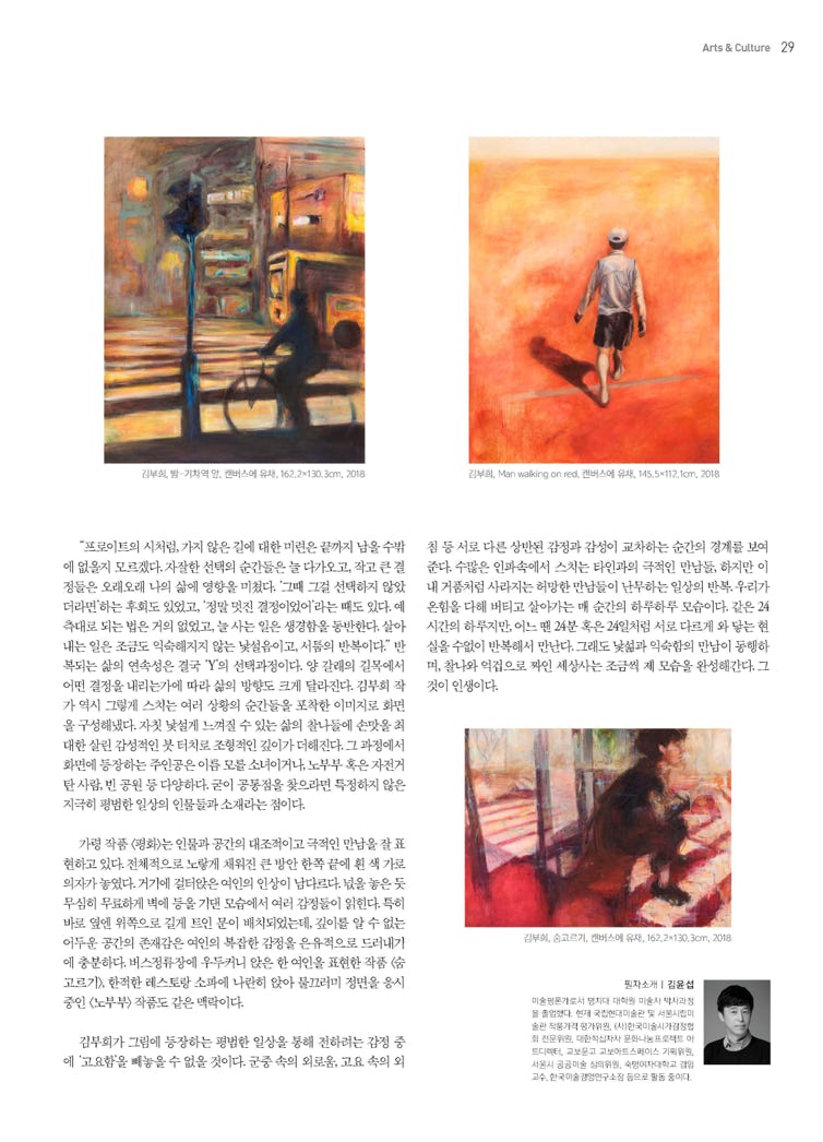 반복되는 삶의 연속성은 결국 'Y'의 선택과정이다. 양 갈래의 길목에서 어떤 결정을 내리는가에 따라 삶의 방향도 크게 달라진다. 김부희 작가 역시 그렇게 스치는 여러 상황의 순간들을 포착한 이미지로 화면을 구성해냈다. 자칫 낯설게 느껴질 수 있는 삶의 찰나들에 손맛을 최대한 살린 감성적인 붓 터치로 조형적인 깊이가 더해진다. 그 과정에서 화면에 등장하는 주인공은 이름 모를 소녀이거나, 노부부 혹은 자전거 탄 사람, 빈 공원 등 다양하다. 굳이 공통점을 찾으라면 특정하지 않은 지극히 평범함 일상의 인물들과 소재라는 점이다.